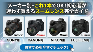 Sony・Canon・Nikon・FUJIFILMの4メーカーそれぞれで「これ1本あれば間違いない」ズームレンズを厳選して紹介。旅行・日常・ポートレートまで幅広く対応できる万能ズームをスペック・メリット・デメリットとともに解説。Amazon・楽天の最安値リンク付き。